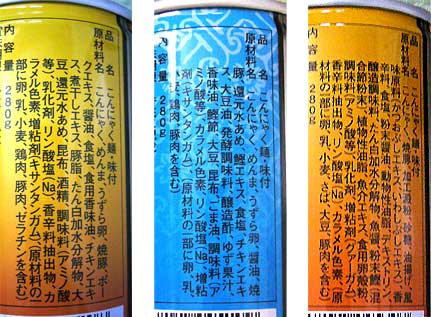 缶に書いてある3種類の麺CANそれぞれの原材料です。